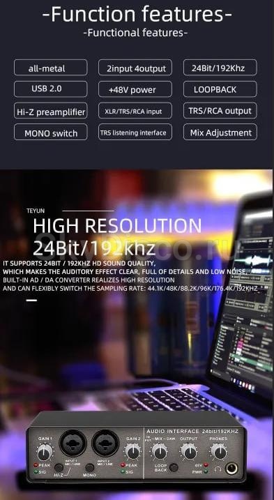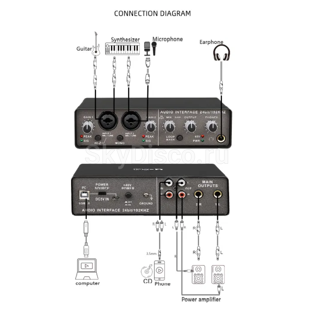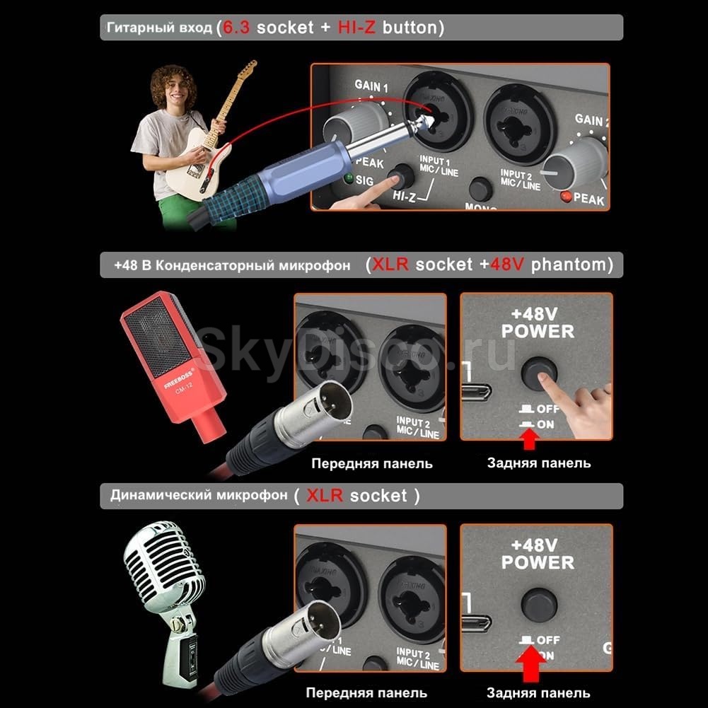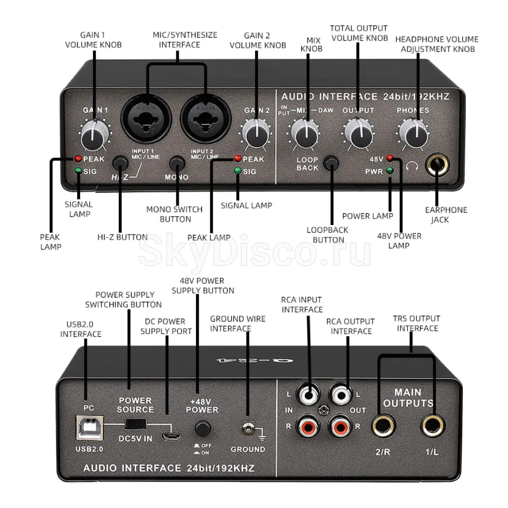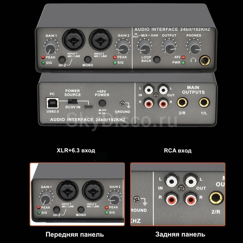 Профессиональная звуковая карта SKYDISCO SC-01 обеспечивает исключительное качество записи. 24-битная глубина записи, частота дискретизации 192 кГц. Динамический отклик и насыщенные низкие частоты делают её идеальной для самых требовательных задач в области звукозаписи. Микрофонный/линейный вход. Ручка управления INPUT-MIX-DAW. Кнопка MONO — плавное переключение между моно и стерео режимами. Кнопка HI-Z. Кнопка LOOPBACK — можно записывать компьютерный аккомпанемент, звук веб-страницы и звук микрофона вместе. Можно записывать только звук микрофона, но не звук компьютера. Универсальные разъёмы RCA для подключения внешних устройств. Основной выход 6.3 TRS и выход для наушников. Источник питания поддерживает компьютерный блок питания USB 2.0 и блок питания постоянного тока 5 В. Фантомное питание +48 В. Корпус плотный и прочный. Обеспечивает высококачественное звучание записанного вокала или музыкальных инструментов. Подходит для различных сценариев: записи на концертах, в студиях звукозаписи, интернет-караоке, АСМР производства и т.д. без ущерба для качества звука.